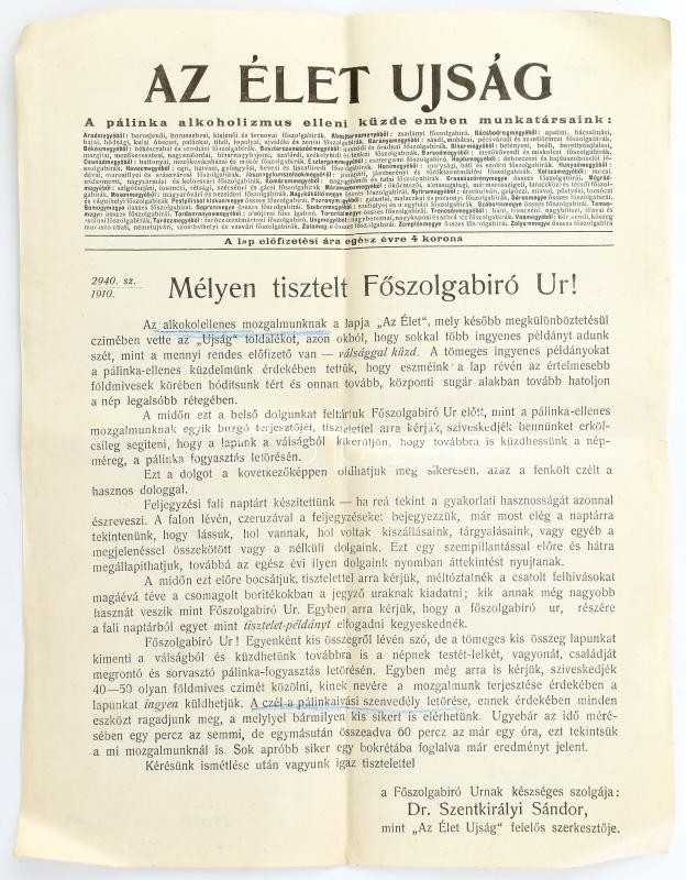 Leírás: cca 1910 Az Élet c. alkoholellenes lap felhívása