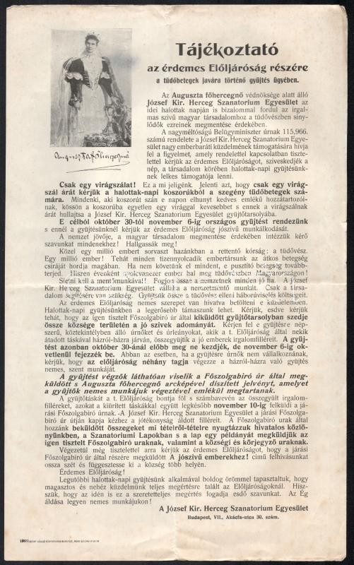 Leírás: cca 1910 József királyi szanatórium felhívása, hirdetmény