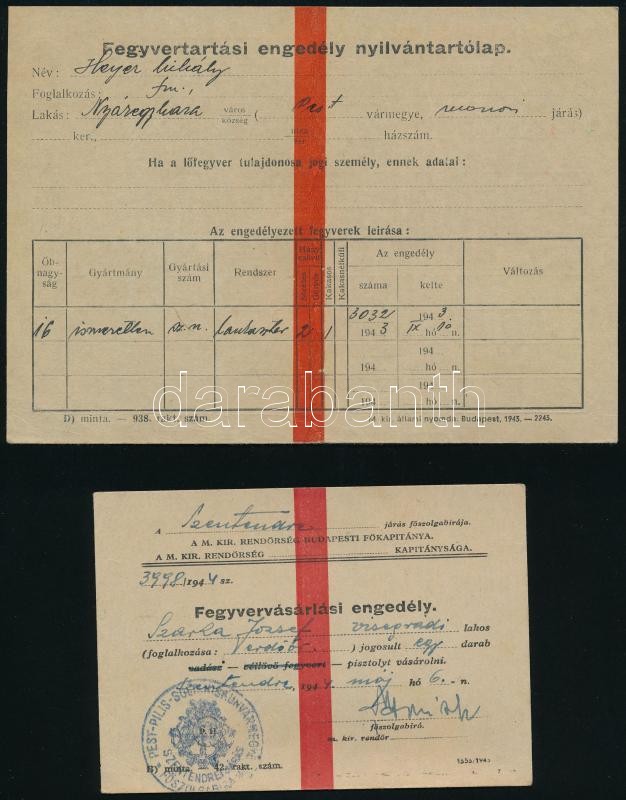 1944 Fegyvertartási engedély és nyilvántartó lap https://www.darabanth.com/hu/410-Gyorsarveres/410.0/Mutargy-papirregiseg-egyeb/Okmanyok~500019/1944-Fegyvertartasi-engedely-es-nyilvantarto-lap~II2548649