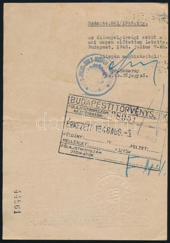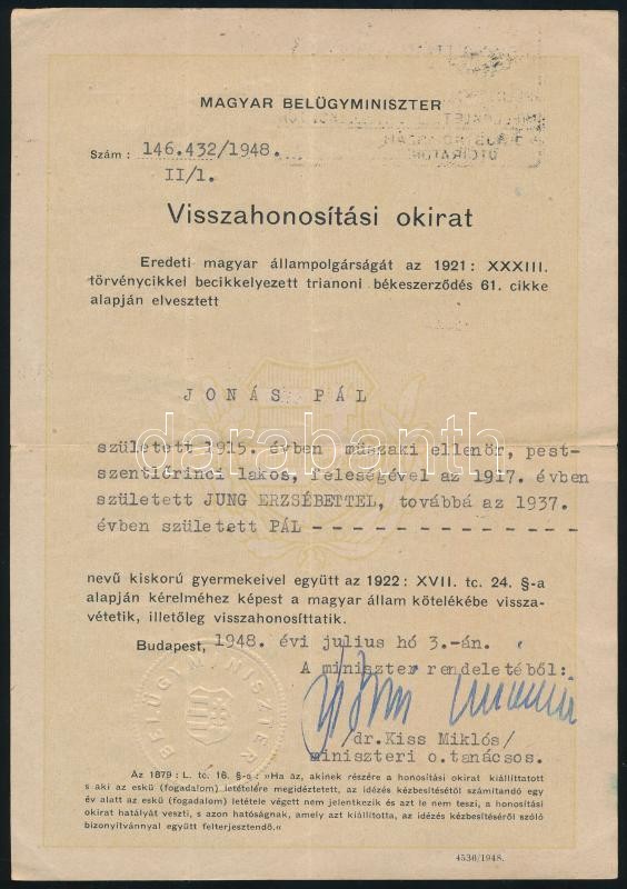 1948 Bp., Belügyminisztériumi visszahonosítási okirat https://www.darabanth.com/hu/410-Gyorsarveres/410.0/Mutargy-papirregiseg-egyeb/Okmanyok~500019/1948-Bp-Belugyminiszteriumi-visszahonositasi-okirat~II2549517