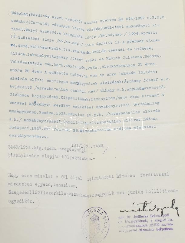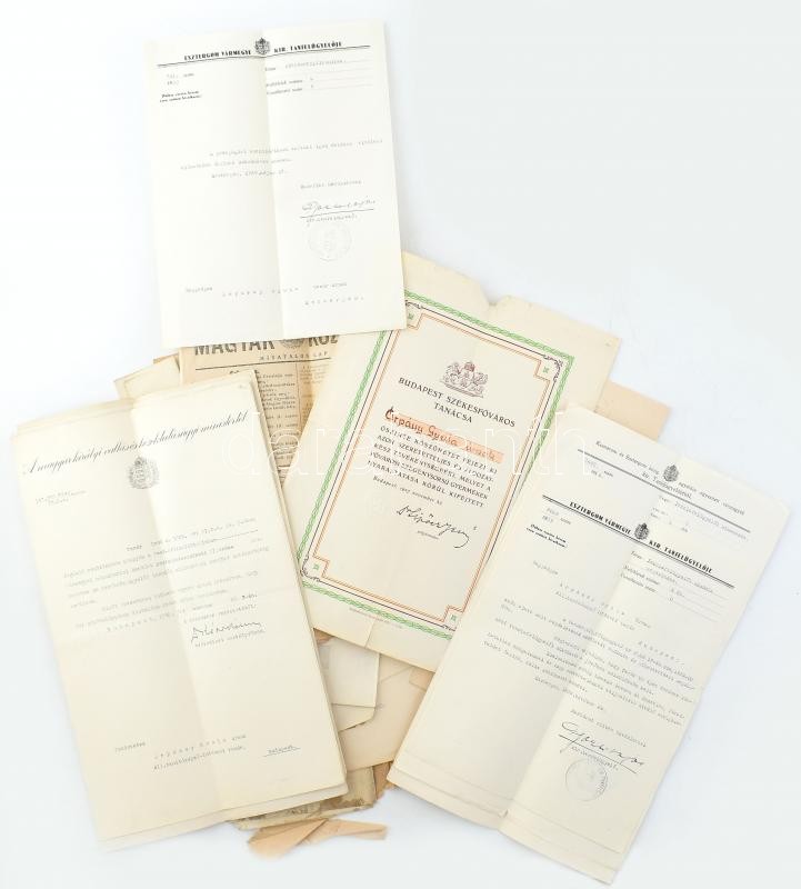 cca 1927-1971 Árpássy Gyula (1904-1974) pedagógus, tanulmányi felügyelő papírhagyatéka, benne a vallás- és közoktatásügyi minisztériumtól kapott hivatalos levelek, köztük több kinevezések tárgyában; Bp. székesfőváros tanácsa által kiállított oklevél, rajta Dr. Sipőcz Jenő főpolgármester nyomtatott aláírásával; munkaviszony-igazolás, stb.