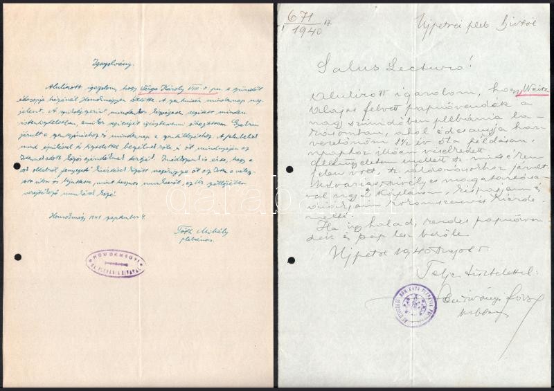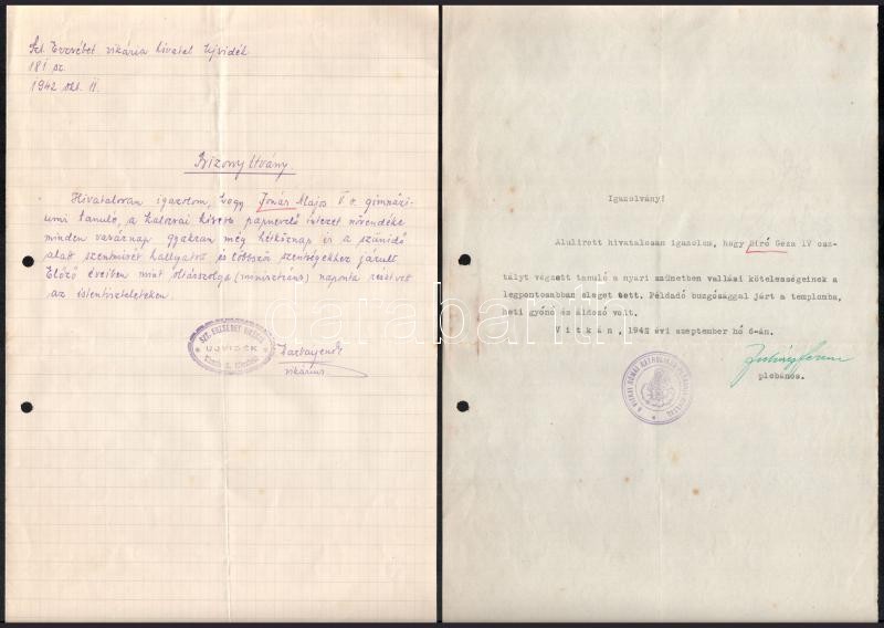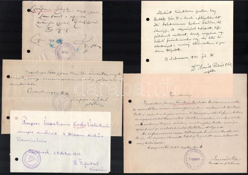 Leírás: cca 1940-42 kb. 17 db templombajárási igazolás Kalocsai Papnevelő Intézet kispapjairól, különböző plébániákról