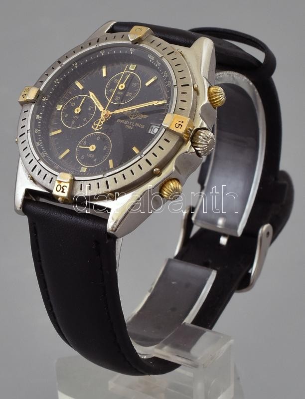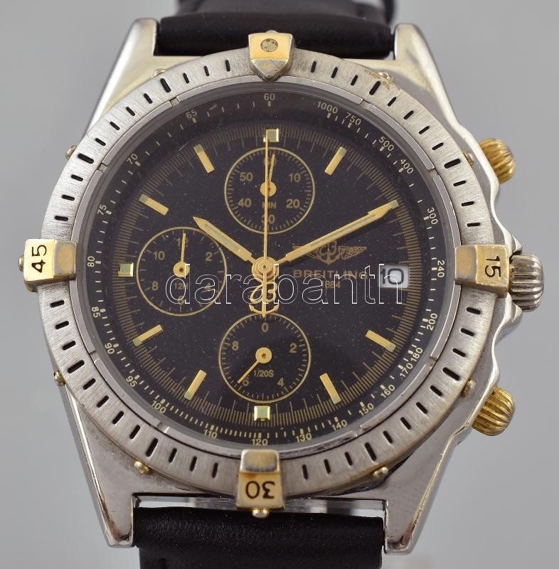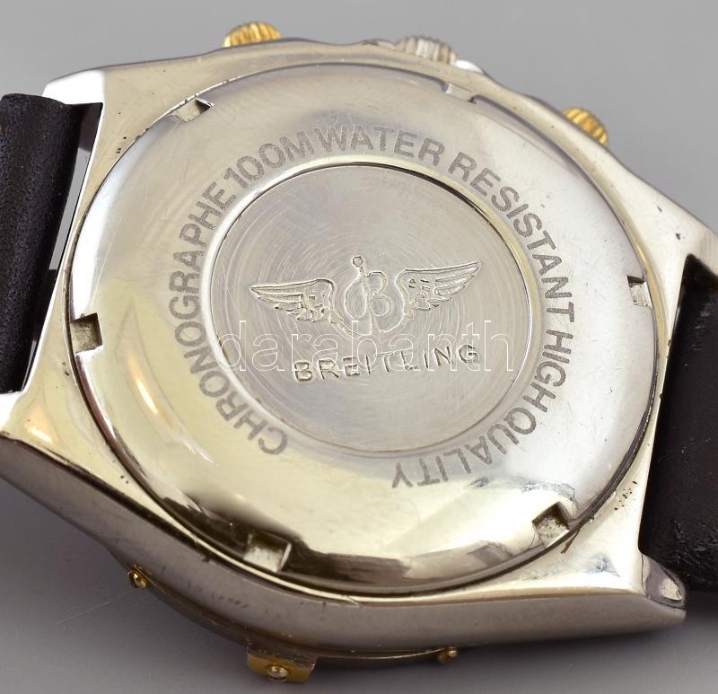 Leírás: Breitling REPLIKA férfi karóra, quartz szerkezettel, analóg kijelzős, flyback kronográf funkcióval, működik, kopott, karcos, bőr szíjjal, d: 38mm