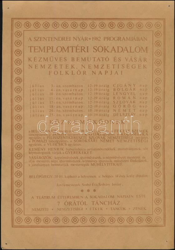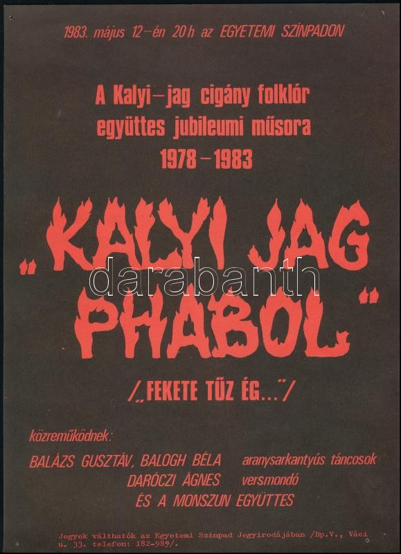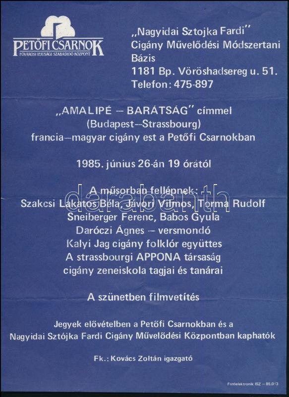 cca 1982-1985 Vegyes plakát tétel, 3 db, Szentendrei Nyár 1982, A Kályi-jag cigány folklór együttes jubileumi műsora 1978-1983, Nagyidai Sztojka Fardi - Petőfi Csarnok: 'Amalipé-Barátság" c. francia-magyar cigány est 1985., kettő plakát sarkain kis lyukakkal, egy hajtott, 29x21 cm és 27x20 cm közötti méretben.