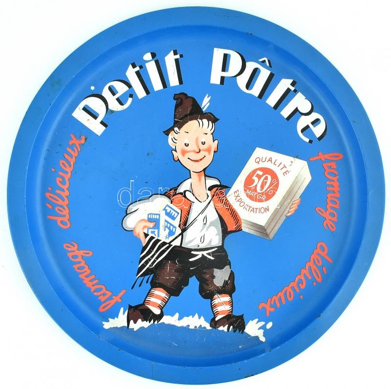 Leírás: cca.1980 PETIT PASTER Delicious Cheese, sajtreklámos, fémlemez tálca, reklámfigurával illusztrálva, kopott d: 32,7cm.