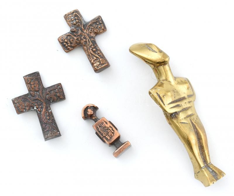 Leírás: 4 db réz, bronz kisplasztika, kopásnyomokkal, m: 5-12 cm