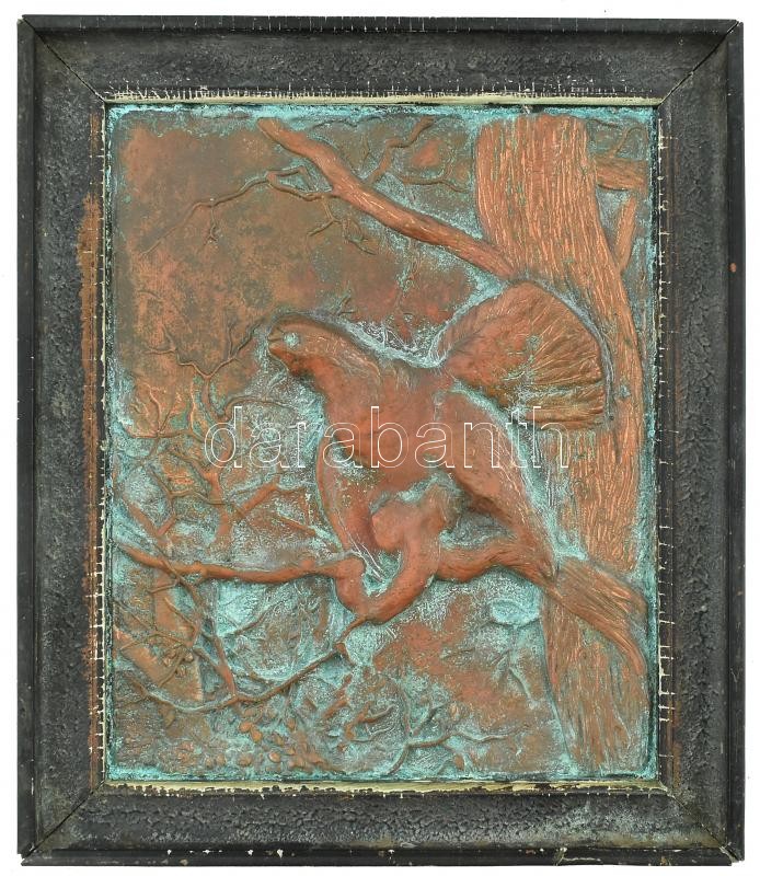 Leírás: Sasmadárt a fán ábrázoló réz dombormű, fa keretben 20x24 cm