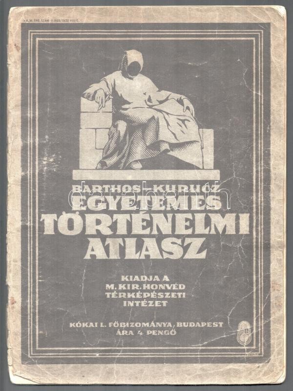 Leírás: cca 1932 Barthos-Kurucz: Egyetemes Történelmi Atlasz. Bp., M. Kir. Állami Térképészet, 40 p. Papírkötésben, kopott, szakadt borítóval.