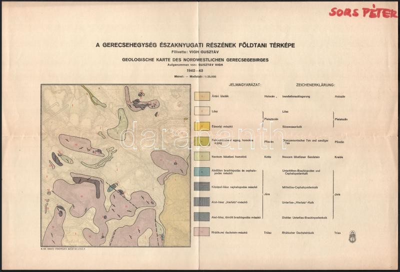cca 1943 A Gerecsehegység északnyugati részének földtani térképe. Fölvette: Vigh Gusztáv. 1 : 25.000. M. Kir. Honvéd Térképészeti Intézet. Jelmagyarázattal, hajtva, apró szakadásokkal, 43x29 cm
