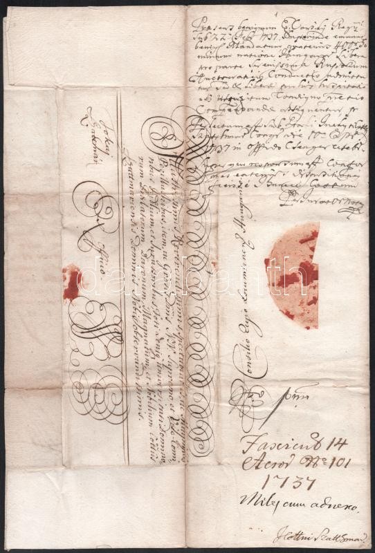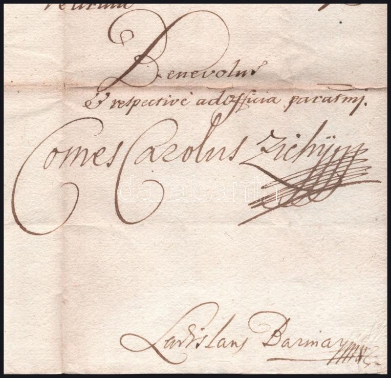 1737 Pozsony, a Helytartótanács tudósító levele (intimatorium) Szatmár vármegyének az orosz hadsereg Cumming és Sztojanov huszárezredeibe toborzandó lovaskatonák ügyében, gróf Zichy Károly helytartótancsi tanácsos aláírásával és Barinay László helytartótanácsi tisztviselő ellenegyzésével. Papír, latin nyelven, külzetén rányomott viaszpecsét nyomával és vármegyei feljegyzéssel. /