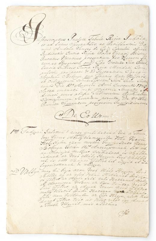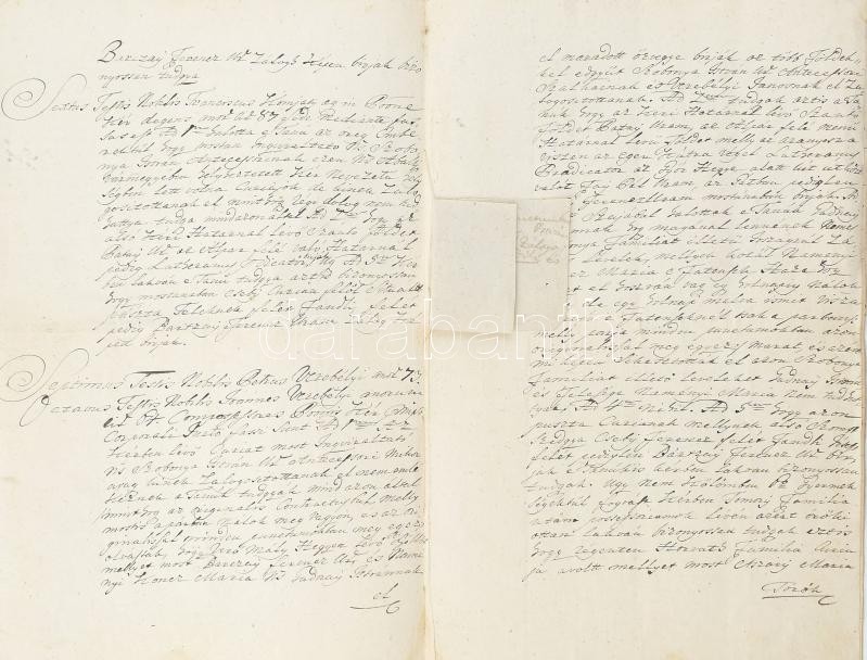1785 Bernátfalva (ma Kassamindszent része, SK), Demeczky Ferenc királyi táblai jegyző által összeállított tanúvallatási (de eo utrum) jegyzőkönyv a Szobonya-család kéri (ma: Abaújkér) birtokviszonyairól, részben magyar nyelven, érdekes részletekkel, rányomott gyűrűspecséttel / 1785 Bernátovce (nowadays part of Valaliky, SK), an witness interrogation record compiled by Ferenc Demeczky, clerk of the Hungarian Royal Court of the Royal Curia regarding the possessions of the Szobonya family in Abaújkér. On paper, written in Latin and Hungarian, with interesting details, with vax seal on it.