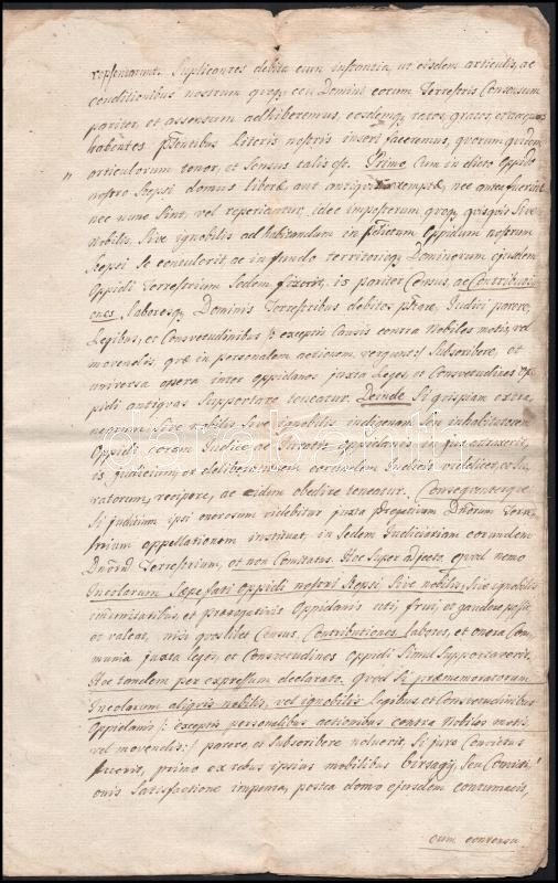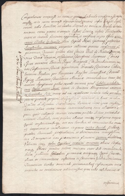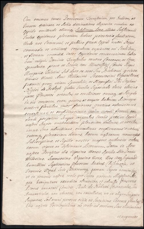 cca 1750 II Ferdinánd 1629. május 5-i oklevelének másolata, amelyben megerősíti az Abaúj vármegyei Szepsi mezőváros (ma: Moldava nad Bodvou, Szlovákia) kiváltságait. Papír, latin nyelven. 6 beírt oldal /