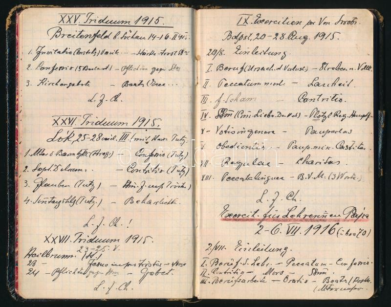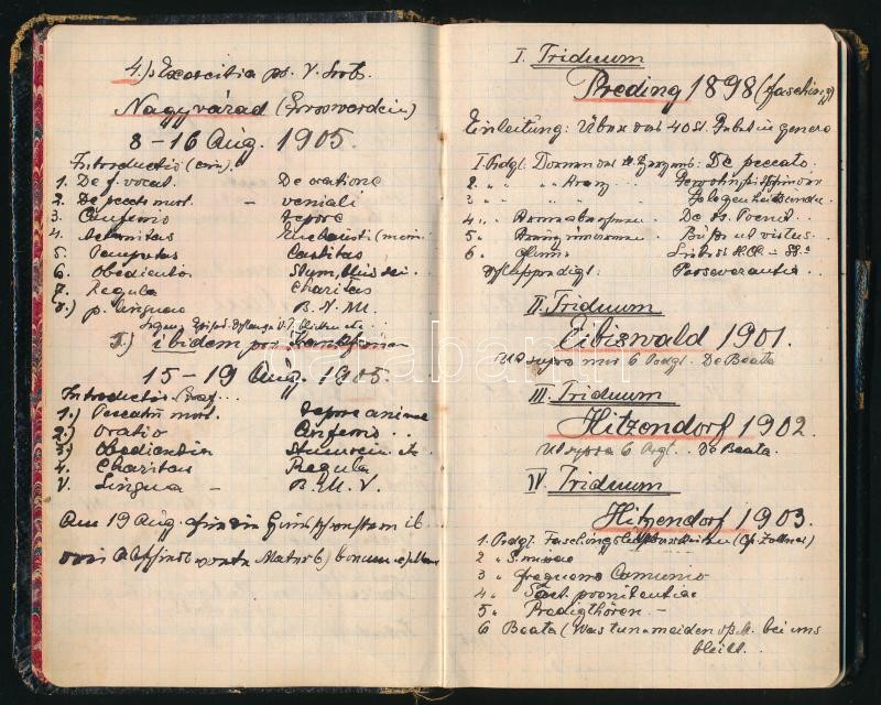 cca 1900-1924 Lazaristák misszióstársaságának vagy egy tagjának könyvecskéje, sok érdekes bejegyzéssel, 1921-től naplószerűen vezetve, korabeli kopott vászonkötésben, festett lapélekkel