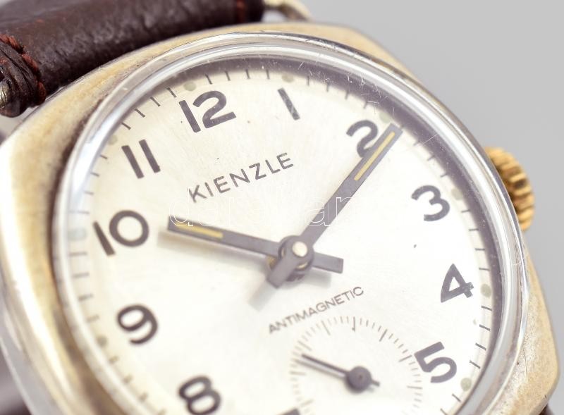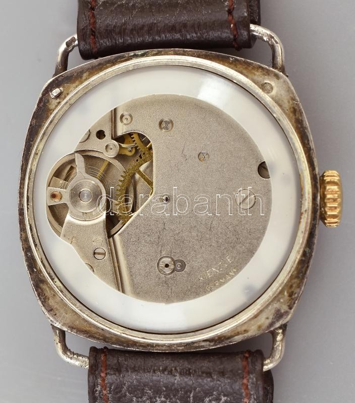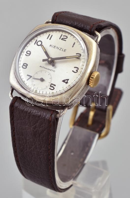 Leírás: Ezüst (Ag) Kienzle férfi karóra, mechanikus szerkezettel, analóg kijelzős, bőrszíjjal, működik, kopott, d:32 mm, jelzett, br:28g