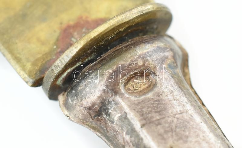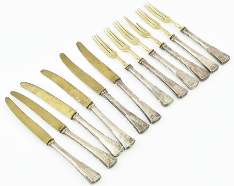 Leírás: Ezüst (Ag) nyelvű desszertes kés és villa, 6-6 db, kb. br. 275 g, egyik villa sérült és hiányos, későbbi papír borítású kopott fadobozban.