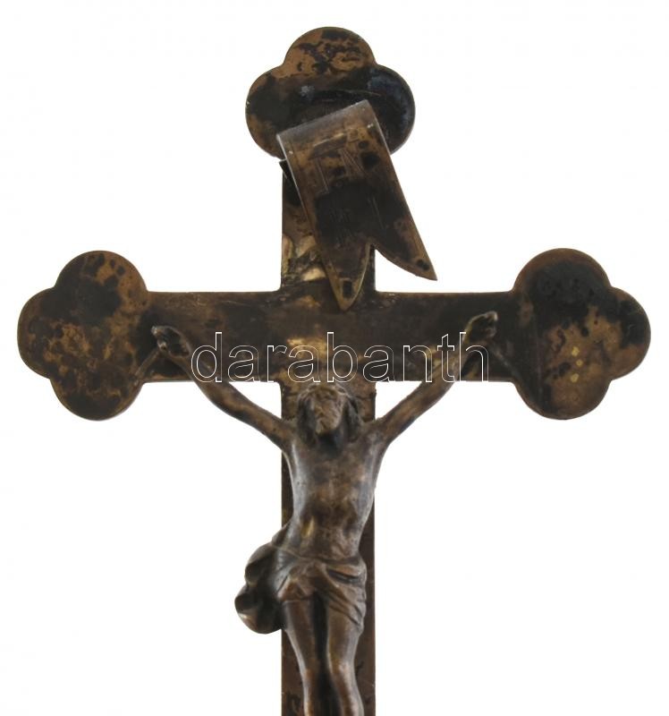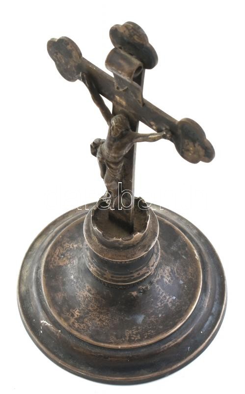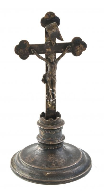 Leírás: Ezüst talpú feszület, fém korpusszal. Jelzett 17 cm