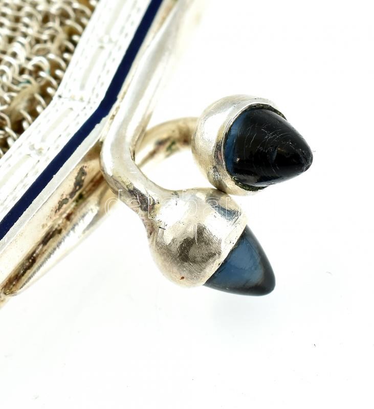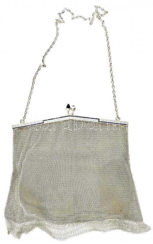 Leírás: Ezüst(Ag) színházi táska szarvasbőr béléssel, jelzett, kis szemhibával, 15×13 cm, bruttó: 152 g