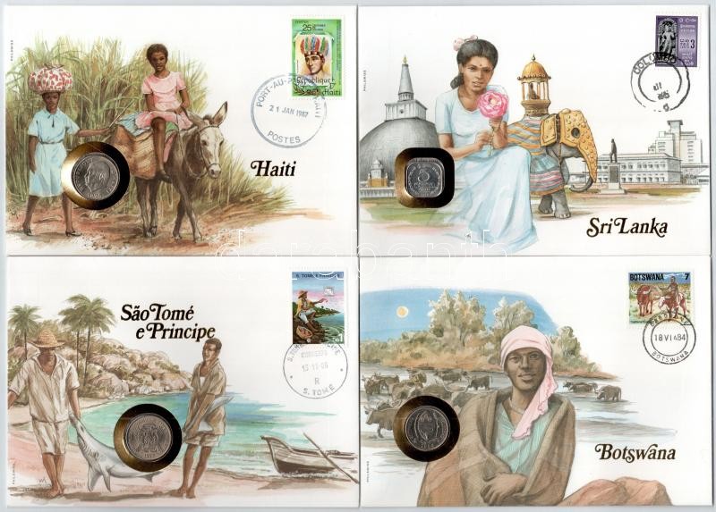 Vegyes 8db érmés boríték tétel, a borítékok állatvilág motívummal, mind német nyelvű leírással, benne Botswana, Sri Lanka, Sao Tomé és Principe, Haiti, Spanyolország, Svédország, Bahamák, Marokkó T:1 Mixed 8pcs of coin envelope lot, the envelopes with animal graphic desgin, all with german language description, including: Botswana, Sri Lanka, Sao Tomé & Principe, Haiti, Spain, Sweden, Bahamas, Morocco C:UNC