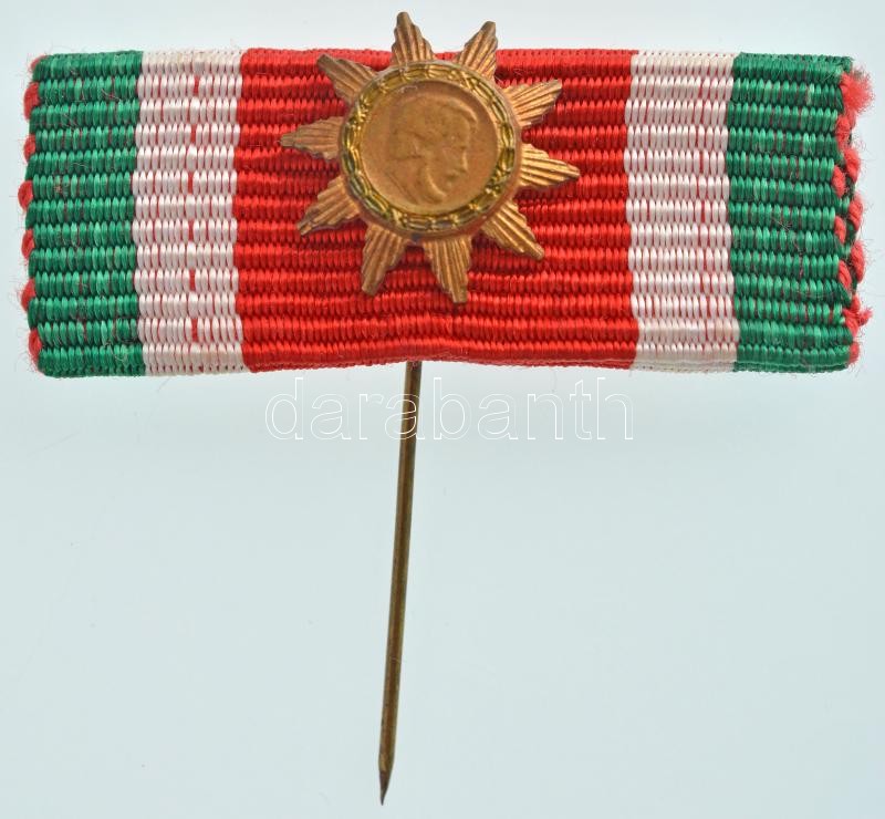 Leírás: 1947. "A Magyar Szabadság Érdemrend bronz fokozata" kitüntetés patinázott bronz miniatűr kitűzője, szalagsávba tűzve T:1,1-