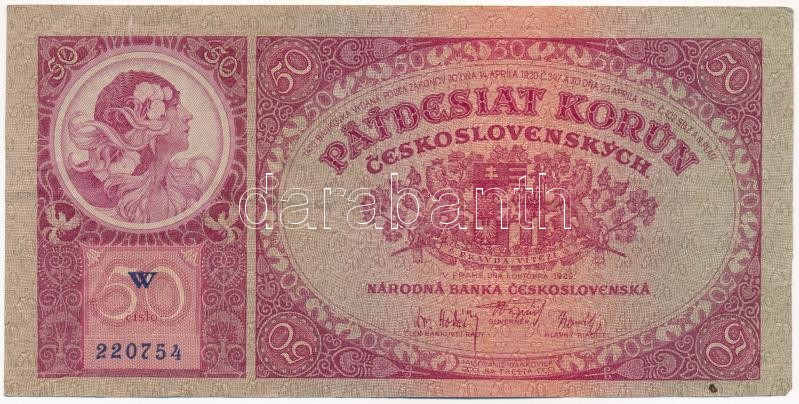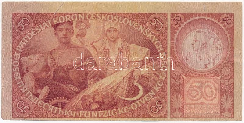 Czechoslovakia 1920. 50 Korun ... https://www.darabanth.com/hu/410-Gyorsarveres/410.0/Numizmatika/Kulfoldi-bankjegyek~2000014/Csehszlovakia-1920-50K-TIII-szakadas-Czechoslovakia-1920-50-Korun-CF-tear-Krause-22a~II2542292