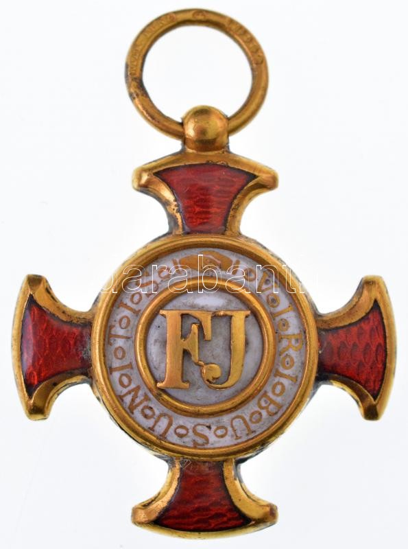 Hungary 1869-1914. "Golden Merit Cross" gilt, enamelled Br decoration with ribbon and with maker's mark "WILH KUNZ - WIEN X." and with star mark C:XF