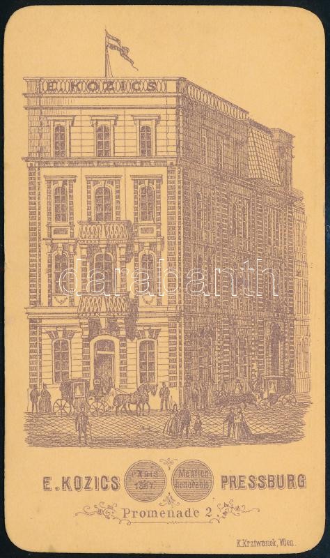 Leírás: cca 1870 Fiatal hölgy egész alakos műtermi portréja, keményhátú fotó Kozics pozsonyi műterméből, hátoldalon a műterem képével, 10×6 cm
