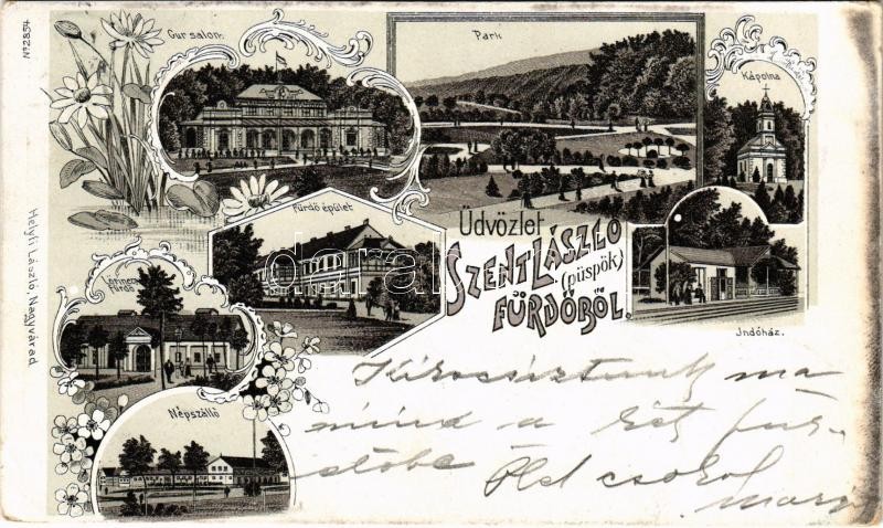 1901 Püspökfürdő, Szentlászlófürdő, Baile 1 Mai; fürdő épület, indóház, vasútállomás, park, Lőrinc fürdő, Népszálló. Sonnenfeld Adolf kiadása / spa, railway station, park, hotel. Art Nouveau, floral, litho (EK)