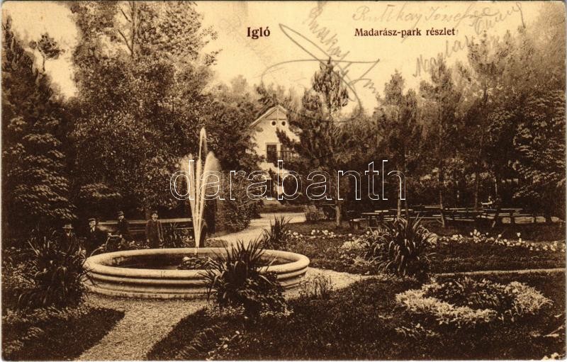 Leírás: Igló, Zipser Neudorf, Spisská Nová Ves; Madarász park részlet / park, fountain + "IGLÓ P.U."