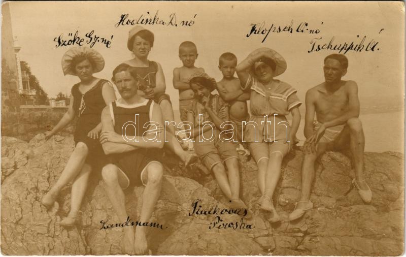 Leírás: Abbazia, Opatija; családi nyaralás, fürdőzők / family holiday, bathing people. Photogr. Atelier Müller Villa Elvire 1913.