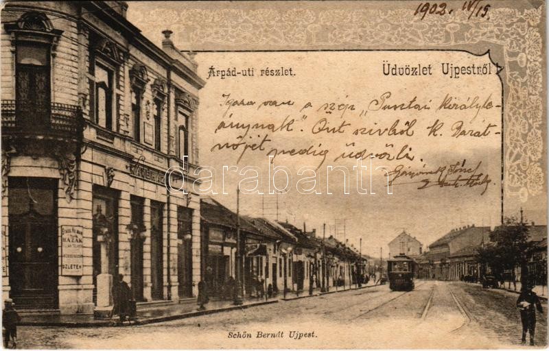 1902 Budapest IV. Újpest, Árpád úti részlet, kávéház, villamos. Schön ... https://www.darabanth.com/hu/411-Gyorsarveres/411.0/Kepeslapok/Magyarorszag~1000005/1902-Budapest-IV-Ujpest-Arpad-uti-reszlet-kavehaz-villamos-Schon-Bernat-kiadasa-fl~II2558896
