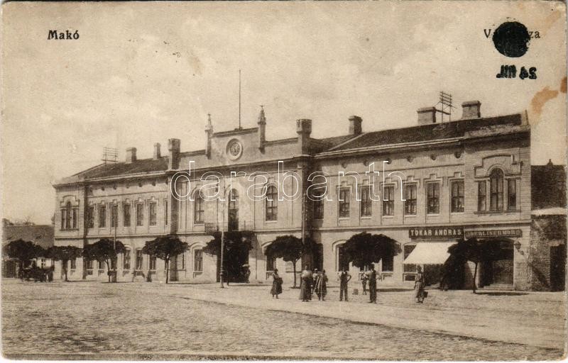 Leírás: 1925 Makó, Városháza, Tokár András, Berliner Mór üzlete. Vasúti levelezőlapárusítás 639. (EK)