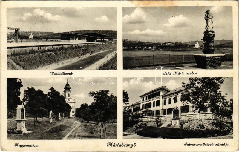 Leírás: 1939 Máriabesnyő (Gödöllő), vasútállomás, Szűz Mária szobor, Kegytemplom, Salvator nővérek zárdája (Rb)