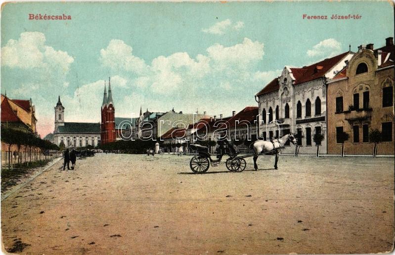 Leírás: Békéscsaba, Ferenc József tér, Békésmegyei Gazdasági Egyesület székháza, Békésmegyei Általános Takarékpénztár, templomok, hintó. Kiadja Tevan Adolf