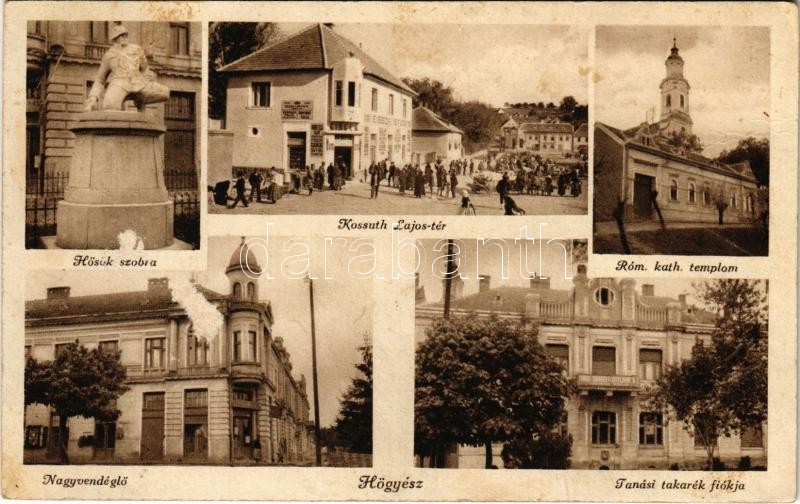 Hőgyész, Hősök szobra, emlékmű, Kossuth Lajos tér, Római katolikus templom, Nagyvendéglő, Tanácsi takarék fiókja, Eibeck István üzlete és saját kiadása. Neuvelt foto (Rb)