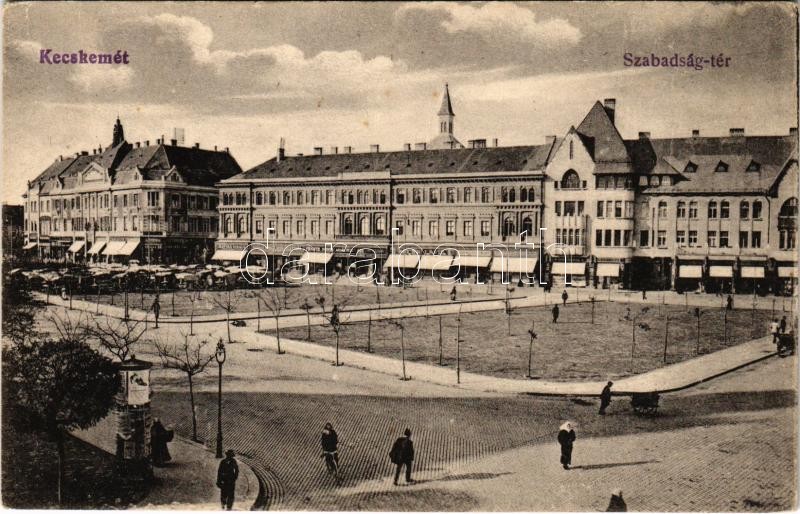 Leírás: Kecskemét, Szabadság tér, üzletek, piac, drogéria. Gross Simon kiadása (EK)