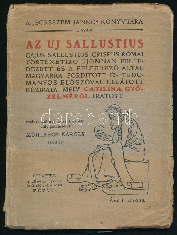 (Bleuer Sámuel): Az uj Sallustius. Cajus Sallustius Crispus római történetiró egyszer csak felfedezett és a felfedező által magyarra forditott és tudományos előszóval ellátott kézirata, mely Catilina győzelméről iratott...Bp. 1907. Borsszem Jankó. 60 l. 1 lev. A ,,Borsszem Jankó" könyvtára. 1. szám. Fűzve, illusztrált kiadói borítékban, szakadásokkal, hiányos gerinccel