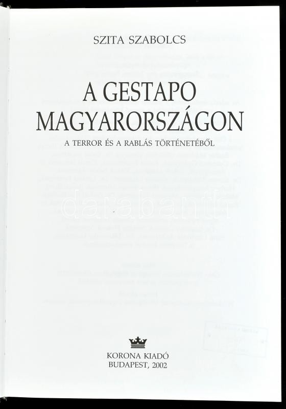 Szita Szabolcs: A Gestapo Magyarországon. Bp., 2002, Korona Kiadó . Fekete-fehér képekkel illusztrált. Kiadói kartonált papírkötés, volt könyvtári példány.