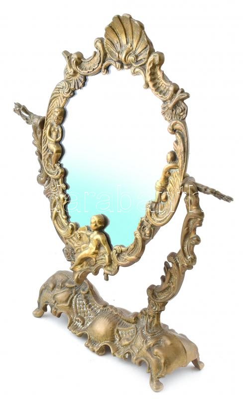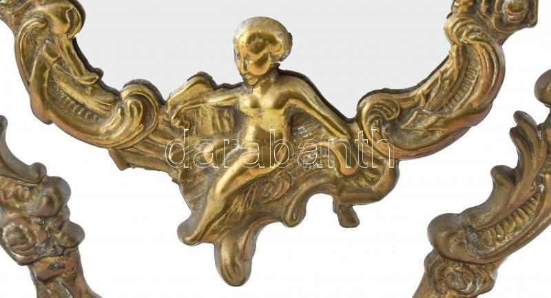 Leírás: Neobarokk öntött, patinázott bronz tükör, puttókkal, barokk kagylóval díszítve, kopott, m:35cm