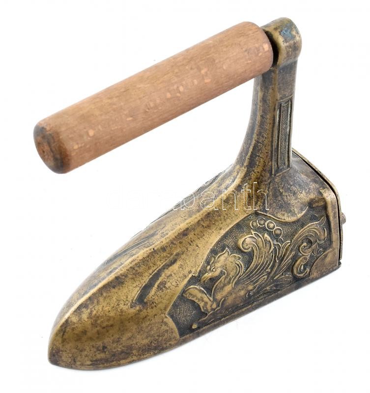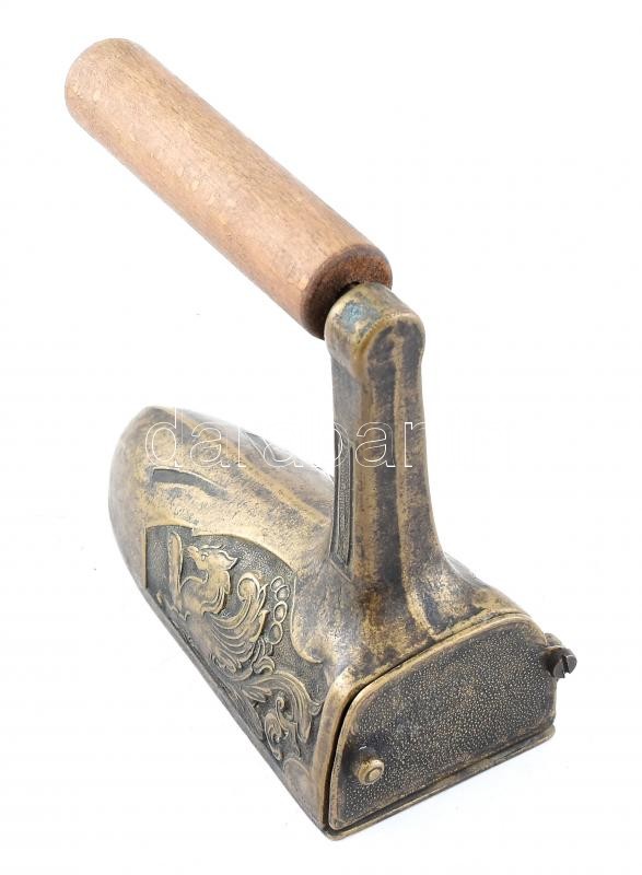 Leírás: Szecessziós vasaló, melegítő vassal, kopott, jelzés nélkül, bronz, m:16,5cm