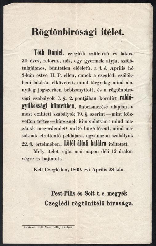 1869 Cegléd, rablógyilkos rögtön bírósági ítélete. 22x35 cm https://www.darabanth.com/hu/411-Gyorsarveres/411.0/Mutargy-papirregiseg-egyeb/Nyomtatvanyok~1500002/1869-Cegled-rablogyilkos-rogton-birosagi-itelete-22x35-cm~II2549700