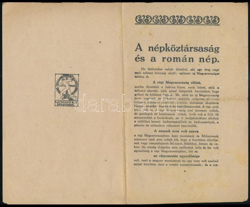 1919 A Népköztársaság és a román nép 7p. Lapkiadó RT. Kolozsvár. https://www.darabanth.com/hu/411-Gyorsarveres/411.0/Mutargy-papirregiseg-egyeb/Nyomtatvanyok~1500002/1919-A-Nepkoztarsasag-es-a-roman-nep-7p-Lapkiado-RT-Kolozsvar~II2555154