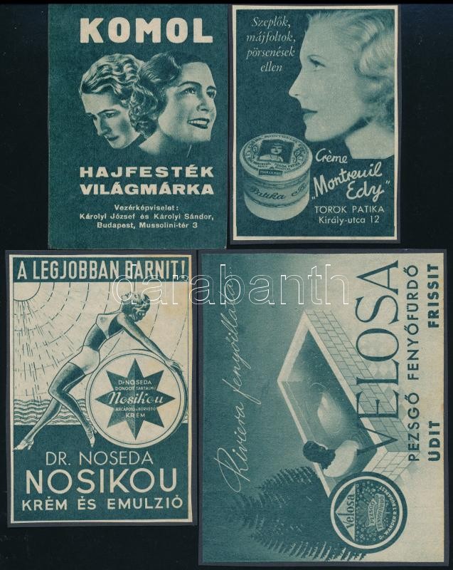 cca 1920-1940 Vegyes illusztrált reklám nyomtatvány tétel, 4 db: "Riviera fenyőillata...Velosa pezsgő fenyőfürdő üdít és frissít."; "A legjobban barnít! Dr. Nosikou krém és emulzió."; "Szeplők, májfoltok, pörsenések ellen Créme "Montreuil Edy""; "Komol hajfesték világmárka", kartonokra kasírozva, 11x13 cm és 10x7 cm közötti méretekben.