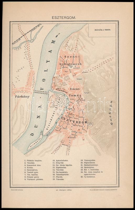 Leírás: cca 1900 Esztergom város térképe, 1:7000, Pallas Nagy Lexikona, Bp., Pallas-ny., 19x12,5 cm