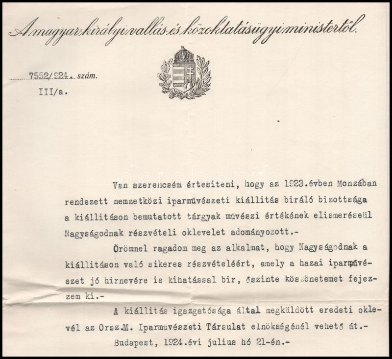 1924 Klebersberg Kunó vallás és közoktatásügyi miniszter aláírása hivatalos levélen kismarty Lechner Jenő építésznek, melyben értesíti, hogy iparművészeti kiállítás dicsérő oklevelét nyerte el.