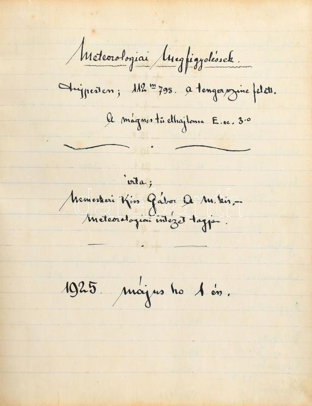 Leírás: 1925 Meteorológiai megfigyelések, írta: Nemeskéri Kiss Gábor a m. kir. meteorológiai intézet tagja