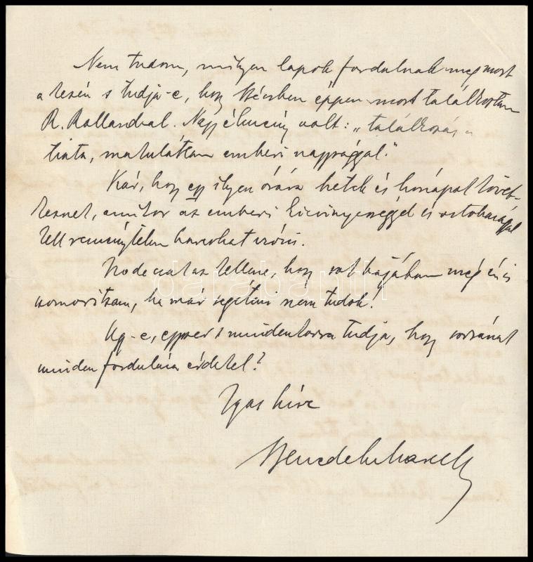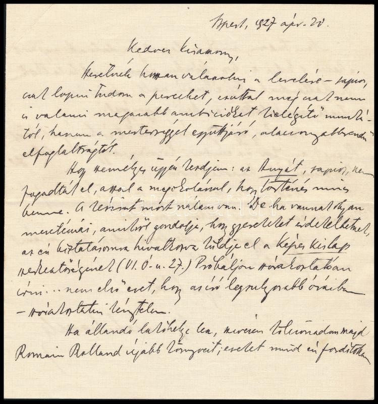 1927 Benedek Marcell (1885-1968) autográf levele ismeretlen hölgy írópalántának, aki írásairól tanácsát kérte. Benedek a levélben beszámol Romain Rolland (1866-1944) Nobel-díjas francia íróval történt bécsi találkozásáról is, akinek művei fordítására is vállalkozott. Két beírt oldal, Benedek Marcell autográf aláírásával.