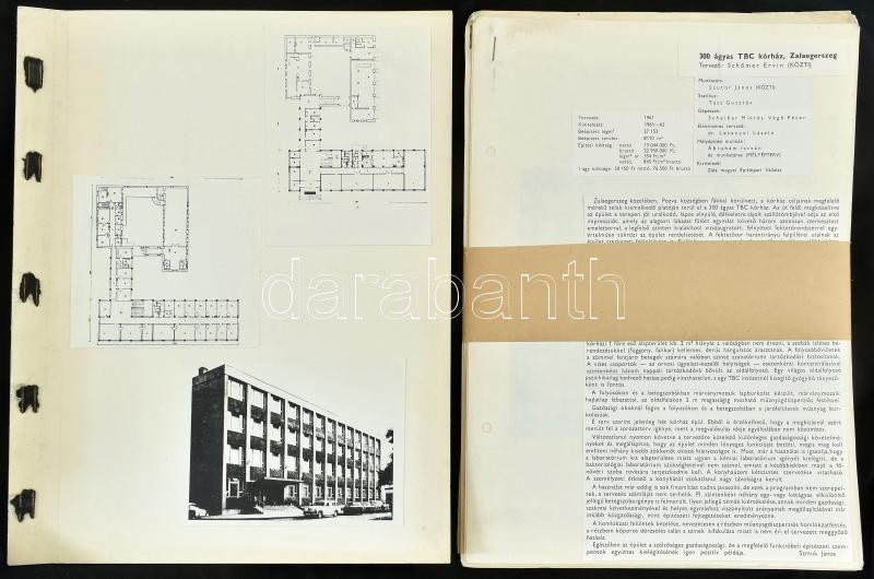 cca 1960-1970 Különféle épületek összegyűjtött adatlapjai, közte Zalaegerszeg, 300 ágyas TBC kórház, Hajdúszoboszló, SZOT "Béke" Gyógyüdülő, Debrecen, TBC Gondozó, MSZMP budapesti pártbizottság épülete (Bp., XI. Villányi út, Balogh István), Szeged, Sportcsarnok (Malomsoky József), Kecskemét, Művelődési Központ (Kerekes István), Székesfehérvár, Domus (Lázár Antal), Bp., Skála (Kovách István),...stb.Képekkel, illusztrációkkal, alaprajzokkal, adatokkal...stb. F. Rados Márta (1931-2021) építész hagyatékából.