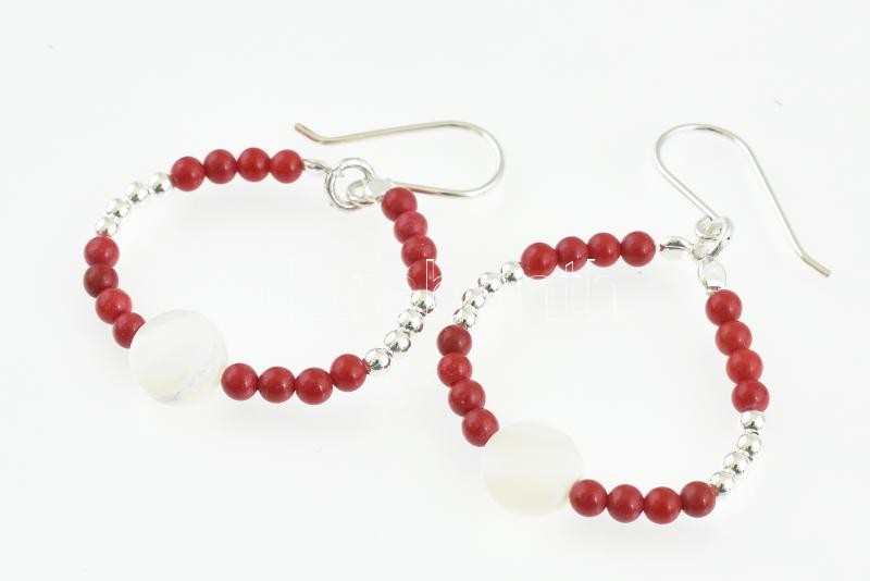 Leírás: Ezüst(Ag) fülbevalópár korall és gyöngyház díszítéssel, jelzés nélkül, h: 3 cm, bruttó: 3 g
