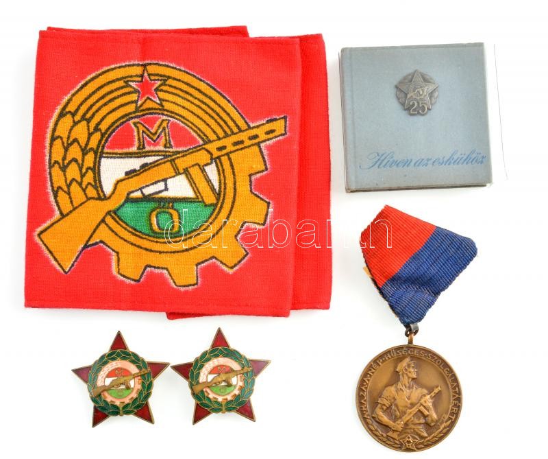 Leírás: ~1960-1970. "Munkásőr" Br kitüntetés mellszalagon + "Híven az eskühöz" minikönyv a Munkásőrség alapításának 25. évfordulójára + "Munkásőrség" zománcozott jelvény (2db) + munkásőr karszalag T:1-2