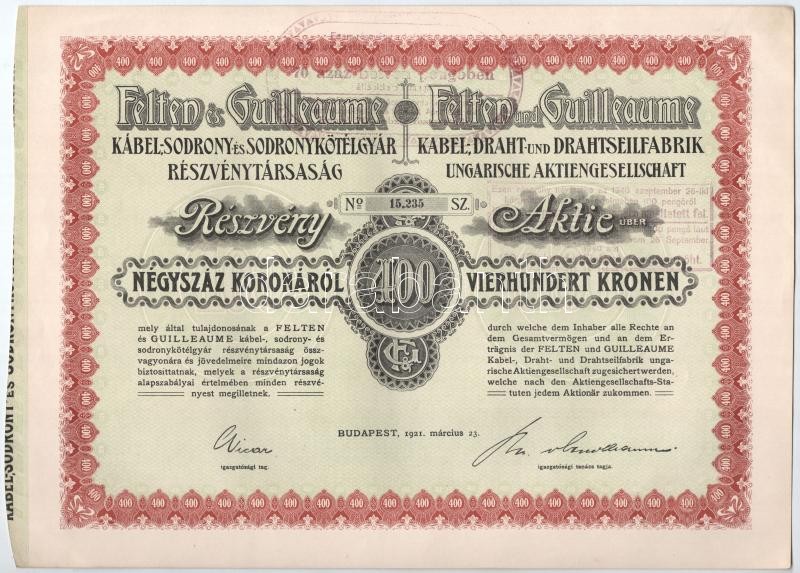 Budapest 1921. "Felten és Guilleaume Kábel-, Sodrony- és Sodronykötélg... https://www.darabanth.com/hu/411-Gyorsarveres/411.0/Numizmatika/Reszvenyek-es-sorsjegyek~2000005/Budapest-1921-Felten-es-Guilleaume-Kabel-Sodrony-es-Sodronykotelgyar-Reszvenytarsasag~II2555380